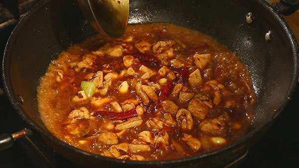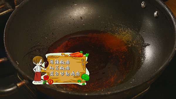4.辣椒油混合花椒油炒制鸡肉。