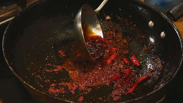 3.放入郫县豆瓣酱、辣椒面、干辣椒、花椒、豆豉炒香后,取出。