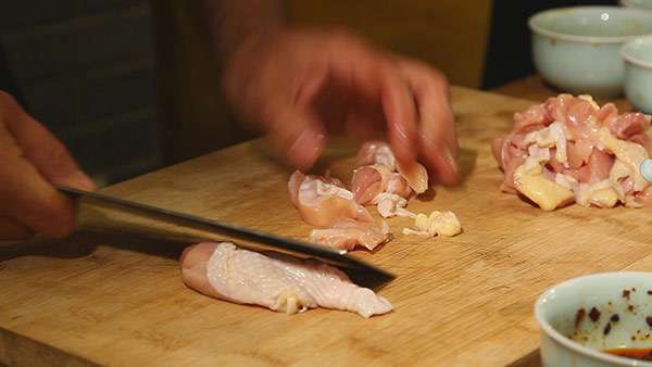 1.将鸡腿肉切成栗子大小的块。