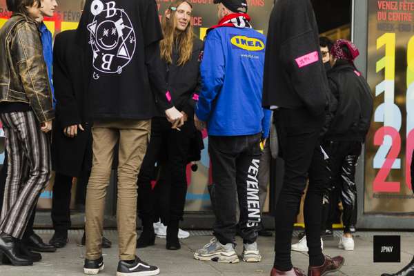 其实时尚圈这股妖风可以追溯到去年9月份,在2017春夏巴黎时装周上,设计师Demna Gvasalia穿着一件蓝色宜家员工服出现在自家品牌 Vetements 的秀场