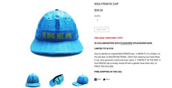 率先出手的是美国街头品牌 PLEASURES 与ChinatownMarket,二者联名推出了一款售价 38 刀,同样名为 FRAKTA 的“宜家帽”。