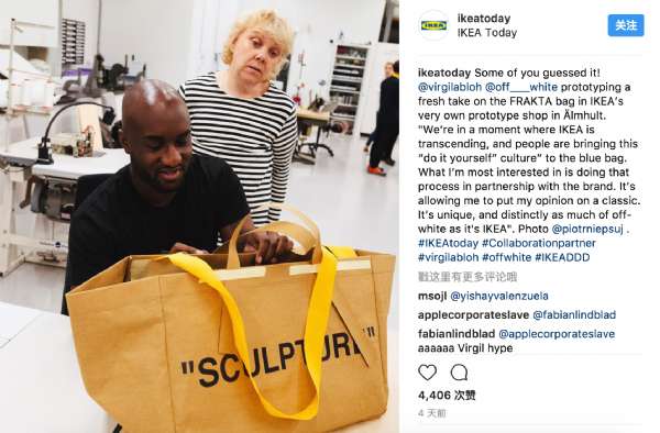 宜家宣布合作的同时,还在其官方ins上面贴出了 Off-White 创始人兼创意总监 Virgil Abloh 设计的联名 FRAKTA 购物袋,包的一侧还写着“sculpture”。