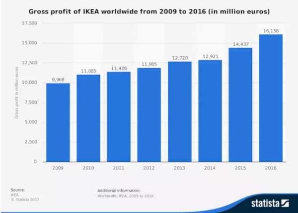 宜家在全球只长期雇有16名设计师,大部分产品采取项目制合作方式。鼓励这些设计师更好地工作当然不会是这些变化的唯一原因。如果你查看宜家从2009至2016年的净营收和毛利润变化,会发现它从2012开始已经遇到了增长放缓的问题,后两年净营收的增速分别只有3.6%和0.4%。2016年,集团销售额较上年增速放缓到7.1%,收益中还有一半来自新店。但按照此前公布的“2020年达到500亿欧元销售额”的计划,宜家需要保持平均每年10%的销售额增长。
