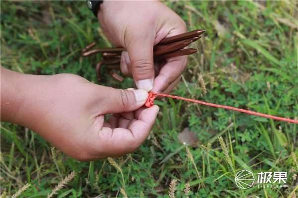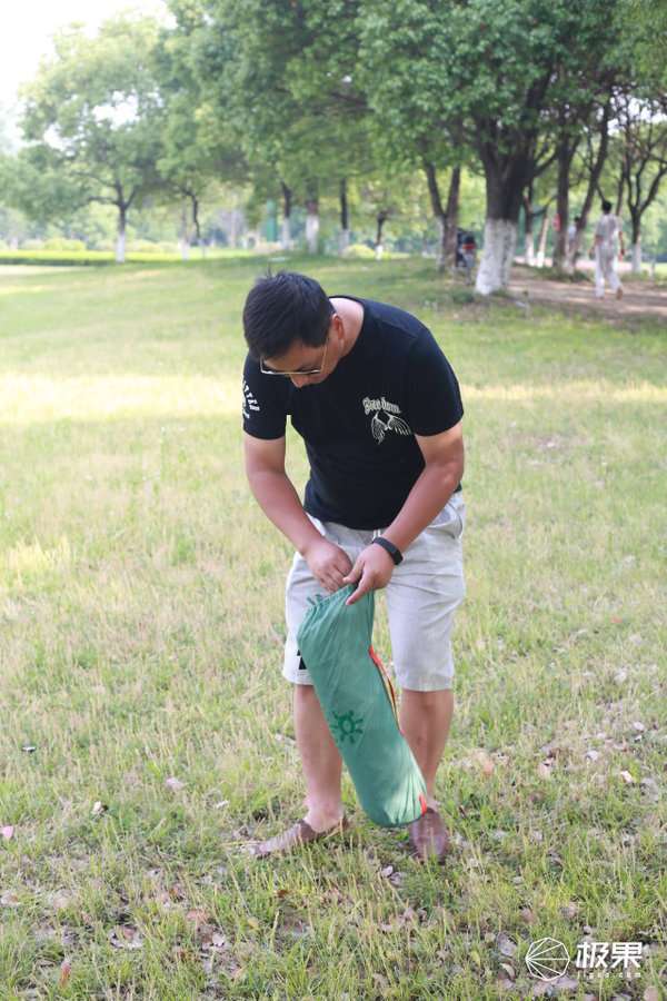 从收纳袋出抽出帐篷、支架杆