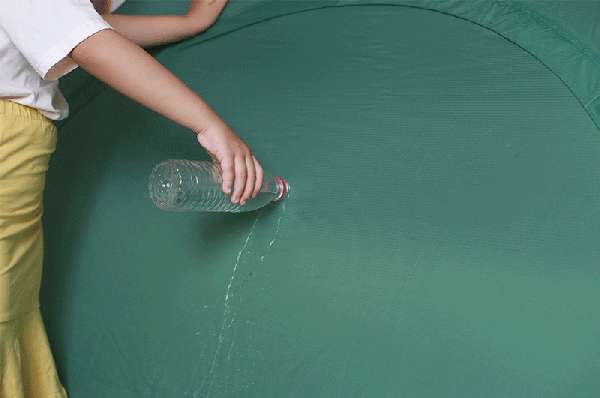 住帐篷面料上泼上水,水很顺顺着面料下滑,表面上只有少许水珠。翻开面料另一面,完全没有水渗透现象。