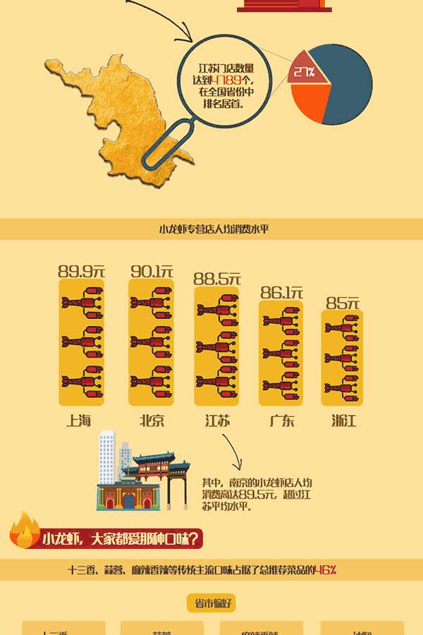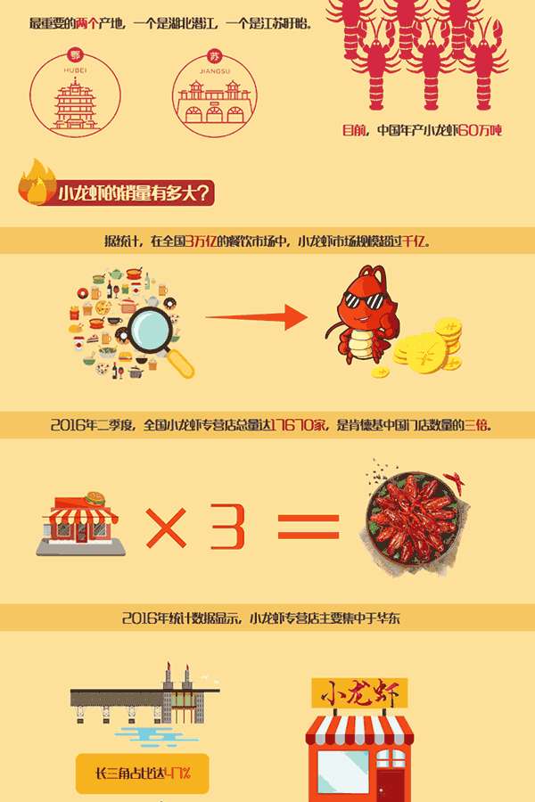 新华网江苏频道用图片展示了小龙虾的发展状况,在全国3万亿元的餐饮市场中,小龙虾市场规模超过千亿元。截至2016年二季度,全国小龙虾专营店总量达17670家,是肯德基中国门店数量的三倍。
