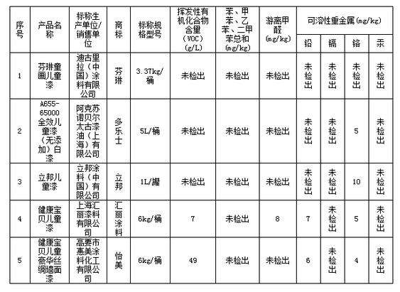 6月13日,上海市消费者权益保护委员会发布对本市流通领域销售的内墙涂料比较试验结果:总体检测结果良好,相关儿童漆产品检测结果显示指标全部合格,但立邦、多乐士、汇丽、怡美等品牌涂料在部分产品仍被检出含有游离甲醛及可溶性重金属物质。