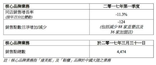 期内,其核心品牌“达芙妮”及“鞋柜”于中国大陆的同店销售增长率下滑11.3%,销售点数目减少124家,其中包括88家直营店和36家加盟店,期末总门店数为4474。