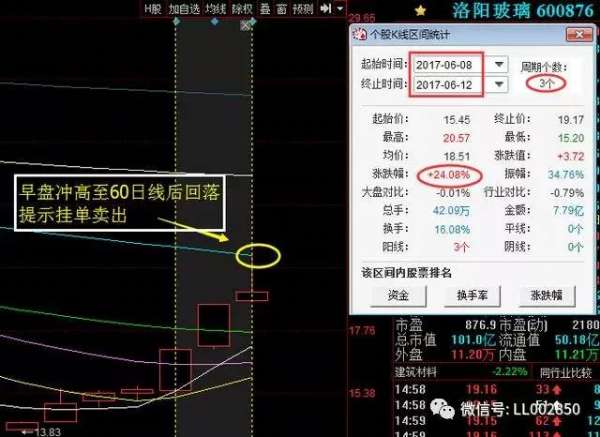 洛阳玻璃,这只票是我一直关注着的,因为在此股这波下跌开始时割肉出局了。。。也可以看到,这波下杀自开始到目前止跌反弹跌幅将近50%之多,现在看看也不免新生庆幸,及时止损了。此股是上周三在圈子(KL002858)中提示关注的,次日提示果断介入,直至当天尾盘突击封板,周五再次涨停,截止今日上冲只60日线压力后止盈暂时出局。3个交易日获利达25%。目前反弹趋势基本确立,下一波的介入时机圈子中会再次提示,注意关注李亚分析。