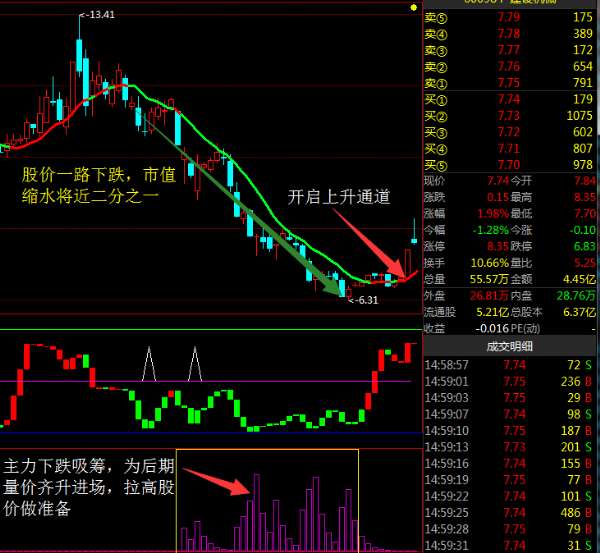 技术面:此股属于超跌反弹+强庄控股,连续下跌后,金针探底打开上升通道,均线多头排列,KDJ和MACD金叉!