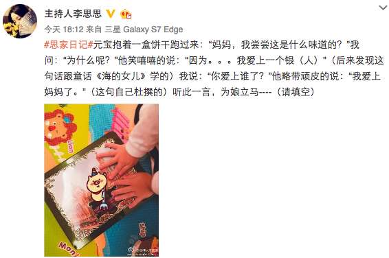 网易娱乐1月24日报道日前,主持人李思思在微博分享日常生活,记录下儿子元宝和她演绎的《海的女儿》桥段。李思思称,当元宝对她说出“我爱上一个银(人)”后,她反问儿子:“你爱上谁了?”李思思直言她此时杜撰了儿子的反应,“他略带顽皮的说:‘我爱上妈妈了。’”随后,李思思还写下,“听此一言,为娘立马——”,并邀请广大网友来填空。