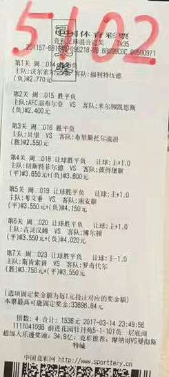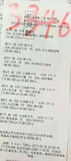 3月14日,还是在顺义区的I智慧竞彩店,还是同一位彩友,投注竞彩足球混合过关7串21,依然是4倍投注,最终以1344元投入中奖3346元,中奖赢利2002元。