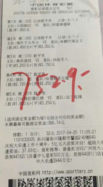 母亲是蒙古族、父亲是汉族的彩友格日勒是这家体彩店的忠实客户。4月25日,格日勒在第33005体彩店招呼其他几个相熟的彩友一起合买,投注了一单竞彩足球混合过关5串1。他所选择的对阵为2场亚冠、1场西甲、1场英冠和1场德甲,可见这是一张经过经挑细选的“海选”投注单。由于采用的是混合过关方式,单票投入为144元。开奖后,格日乐的这张票中奖752元。(见“中奖票4”)
