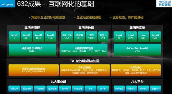 2012年,美的全面确定了“632”战略,旨在全面重构美的信息系统。“632”指的是构建6大运营系统、3大管理平台和2大门户和集成技术平台,构建统一的端到端流程和统一的主数据管理,全集团将投入超过20亿元,历经3年完成。