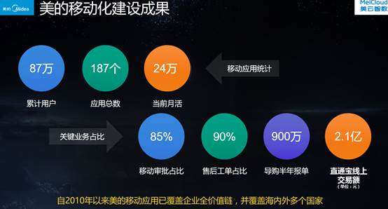 在移动化方面,美的构建了TO C、TO B、TO E的移动化建设布局,通过App+微信,提供面向消费者的一站式服务,并打通企业全流程价值链,实现信息共享,提升协同效率。自2010年以来,美的移动应用已覆盖企业全价值链,并覆盖海内外多个国家。