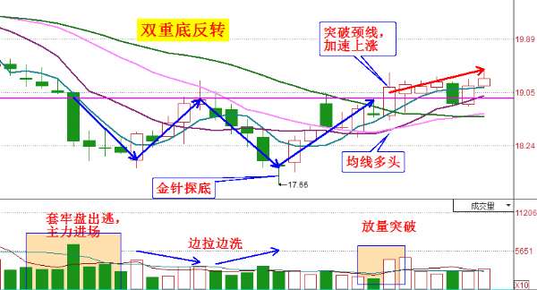 该股从分时盘口上看,有主力大单尖角波拉升,形成脉冲波上涨。成交明细看到大单买入小单卖出,说明主力拉升意愿强烈,实力雄厚。从日线看,股价高位超跌20%,在部形成“双重底”反转,其中左肩放量下跌,有套牢盘出局,主力在打压吸筹。而上涨缩量,下跌放量,明显是大资金在边建仓边洗盘,主力高度控盘。在最低价17.66元形成“金针探底”,是主力盘中打压股价有快速拉回形成的“向下试盘”,测试底部支撑强度。预计后市还有40%-50%的盈利空间!