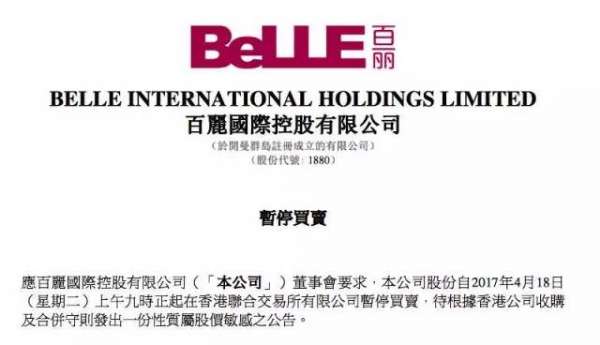 4月18日,百丽国际发布停牌公告,停盘原因是鼎晖投资正与百丽高层研究潜在收购交易,据知情人士透露,鼎辉投资正牵头57亿美元(约合442亿港币)商讨收购百丽国际,而在停牌之前的市值为444.48亿港币。