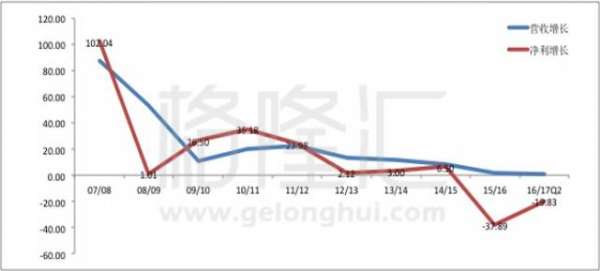净利润增长速度也再没上过两位数,到2015/2016年财年,百丽的净利润大跌近38%。2016/2017财年中期报告,百丽的净利润又再度下滑了近20%。