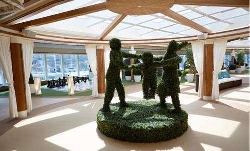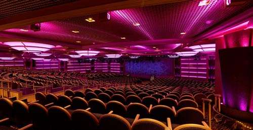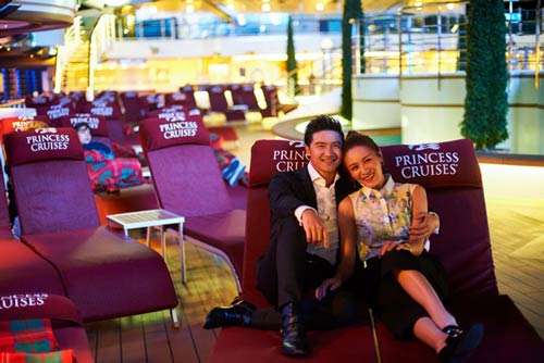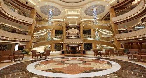 盛世公主号上的中庭广场是整个船队中规模最大的。在这里随处可以看到欧式大理石、马赛克瓷砖地板、波西米亚风情的华丽吊灯、抛光木制品,以及以花卉图案为主体的中国风的装修元素。