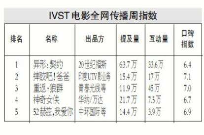 \u00A0\u00A0\u00A0\u00A0在本周电影全网传播指数排行榜中,美国科幻惊悚片《异形》系列前传三部曲的第二部《异形:契约》,国内上映后各项指标均表现不俗,一举摘得榜首。上周冠军《神奇女侠》热度减弱,而已上映近50天的印度片《摔跤吧!爸爸》升至榜单第二。国产动物题材纪录片《重返?狼群》近期上映后口碑表现突出,位列榜单第四。