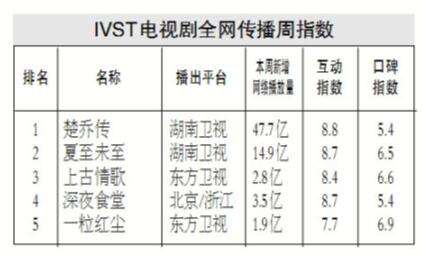 \u00A0\u00A0\u00A0\u00A0在本周电视剧全网传播指数排行榜中,赵丽颖、林更新等领衔主演的古装传奇电视剧《楚乔传》,自开播以来收视率呈明显上升趋势,网络播放量、互动指数同样表现强劲,综合评分远超其他同期电视剧,收获榜单首位。由黄晓明、宋茜等领衔主演的另一古装言情电视剧《上古情歌》,网络播放量相对表现平平,但互动较好,本周升至第三位。