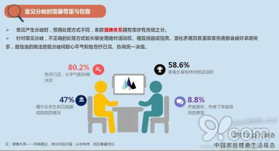 当家庭内产生意见分歧,惯用的处理方式不同,健康关系拥有率亦有高低之分。从数据可以明显看出,针对意见分歧,不正确的处理方式例如长辈使用绝对话语权、相互挑剔指责、激化矛盾真甚至恶意伤害都会破坏家庭关系,最恰当的做法是,就意见分歧问题心平气和地各抒己见、协商统一决定。