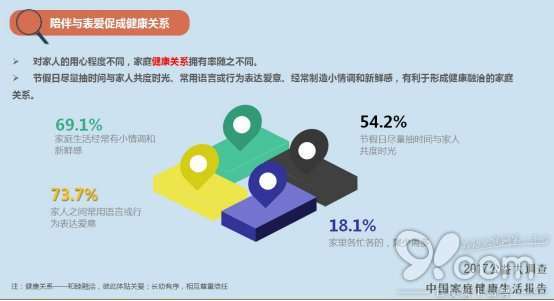 其中,家人之间常用语言或行为表达爱意的家庭,健康关系拥有率高达73.7%,因此,经常向家人表达爱意、尽量抽时间陪伴家人是促成健康家庭关系的法宝。