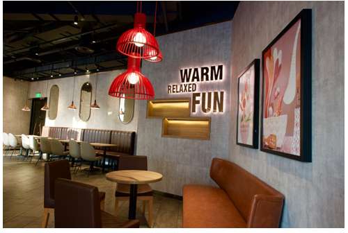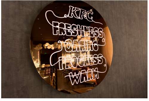这家特别的餐厅装修风格与传统肯德基餐厅完全不同,拥有非常开阔的视角,近400平方米的餐厅整体颜色以灰白为主,约200个云朵状的灯饰让餐厅内外时时有白云飘过,用餐顾客仿佛随时置身于天空之下。而三两盏红色的灯具则让餐厅在冷淡风中有了活力。
