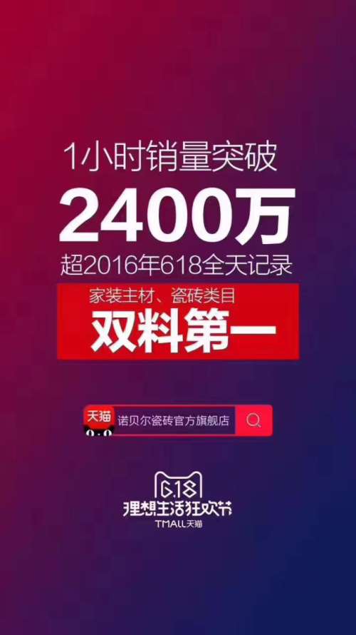 ??正是这一系列的线上、线下的联动宣传,天猫618理想生活家狂欢盛宴刚开始1分钟,诺贝尔瓷砖天猫官方旗舰店交易额已破百万;