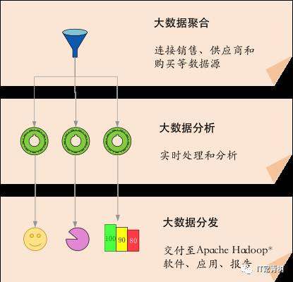 链条性的企业运作中,大数据聚合可以完成多个端口数据分析,整合供应端口、销售端口和消费端口的数据源。各数据源收集的实时处理后,分析后大数据可交付给Apache Hadoop 软件、应用、报告,达成行业运作的最终预测结果。