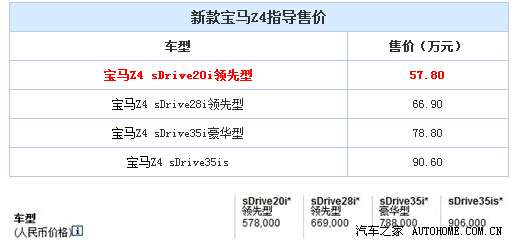 [ 宝马Z4 宝马Z4 了解更多> 指导价:58.30-90.90万 变速箱:手自一体,双离合 发动机:2.0T,3.0T 级 别:跑车 ]这款跑车是我们今天本文的主角,改换换代后的宝马Z4卷土重来,时隔多年,我们又一次见证了经典跑车宝马Z4的崛起,宝马Z4 sDrive28i白阿基66.9万,此外,宝马Z4 sDrive28i搭载代号N20涡轮增压发动机。据我们了解宝马官网上Z4对于现款车型进行整合,仅推出三种动力四款车型,报价与配置也都行了更新。具体价格信息请看下表: