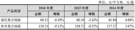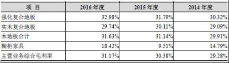 公司报告期内合毛利率持续升主要系受到强化复合地板、实木强化复合地板、实木复合地板业务毛利率上升的影响。报告期内,公司主要产品毛利率和主营业务综合毛利率情况如下: