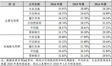 木地板业务毛利是菲林格尔毛利的主要来源。2012年至2016年,菲林格尔主营业务毛利率分别为20.04%、24.46%、29.28%、30.38%、31.17%。同行业上市公司主营毛利率分别为平均值分别为28.16%、28.54%、27.22%、28.61%、28.37%。