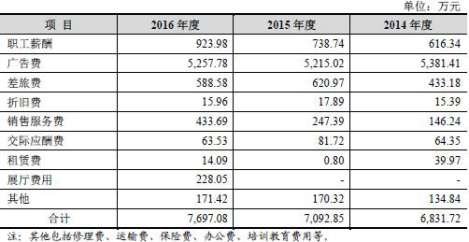 本次募投项目中,“补充流动资金及偿还银行贷款”将使用募集资金8,000万元。 不断加大广告投入 近年来,互联网技术发展突飞猛进,通过电子商务进行的交易活动不断增长,互联网的发展不断冲击传统商业模式。品牌知名度的建立和维护需要较高成本和较长时间的投入。 菲林格尔投入大量流动资金进行产品宣传和市场营销。2012年至2016年,菲林格尔销售费用分别为3,941.69万元、4,924.27万元、6,831.72万元、7,092.85万元、7,697.08万元。 销售费用主要为广告费用,分别为2,199.59万元、3,382.30万元、5,381.41万元、5,215.02万元、5,257.78万元。公司表示,公司各期广告投入包括向代理商提供的广告费用补贴及公司自行投放的广告费用两类情形。公司管理层每年都会根据当年经营目标计划制定广告宣传管理政策,并确定各年广告投放基本预算。