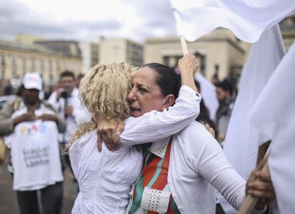 2016年11月24日,在哥伦比亚波哥大,两名支持签署和平协议的女子相互拥抱。(新华社/美联)