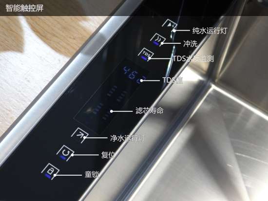 操作台的左侧则是智能操控面板,用户可以通过面板随时观察TDS值、滤芯寿命等,其开机自动默认的TDS值一目了然,真正实现健康好水看得见。
