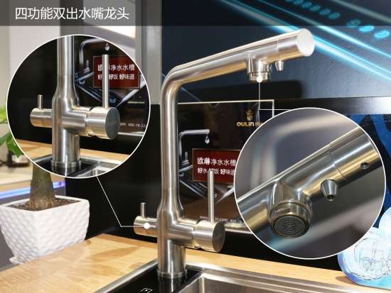 欧琳净水水槽采用四功能双出水嘴龙头,一个龙头,四种出水,一档出冷热水,用于日常洗涤;二档出净水,用净水烹饪饭菜口感更香醇,三档出纯水,可以直接饮用。纯水专享单独出水口,避免交叉感染,全面解决用户的饮水需求。