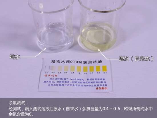 经测试,滴入测试溶液后原水(自来水)余氯含量为0.4~0.6,欧琳所制纯水中余氯含量为0,可见欧琳的过滤效果还是相当不错的。