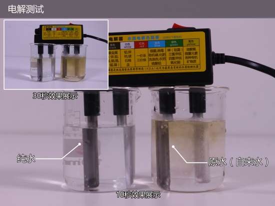 测试10秒后原水经过电解后产生大量气泡,水质明显变得非常浑浊,欧琳所制纯水无大变化;30秒后原水上方漂浮大量杂质,纯水显现微小变化,可见水中的杂质大部分都被滤芯过滤掉了。