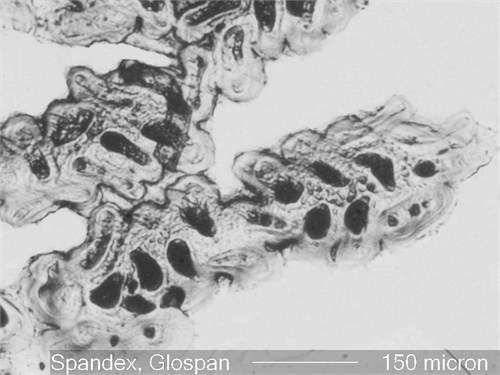 这种弹性面料名为氨纶,学名聚氨基甲酸酯纤维(Polyurethane,简写PU),是一种弹性纤维。它具有高度弹性,能够拉长6~7倍,但随张力的消失能迅速恢复到初始状态——所以笔者当年用了全身的力气去拉扯健美裤,也没有把裤子扯坏。其分子结构为一个像链状的、柔软及可伸长性的聚氨基甲酸酯,通过与硬链段连接在一起而增强其特性。弹性纤维分为两类:一类为聚酯链类;一为聚醚链类。聚酯类弹性纤维抗氧化、抗油性较强;聚醚类弹性纤维防霉性,抗洗涤剂较好。