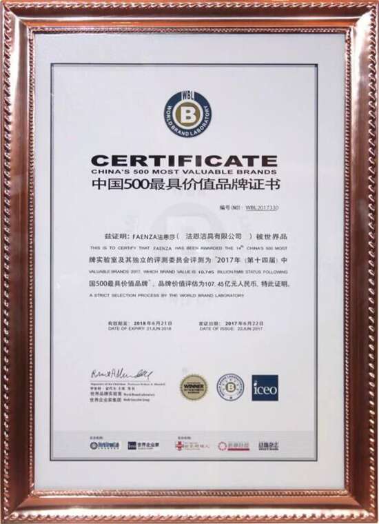 重品质,\u00A0法恩莎瓷砖致力缔造高品质生活,打造享誉世界的“法恩莎品牌”。在2017年《中国500最具价值品牌》中,法恩莎以107.45亿元跻身其中,行业地位毋容置疑!本次“中国500最具价值品牌”名单中,汇聚了中国各行业的翘楚。除法恩莎外,媒体、阿里巴巴、华为等巨头级民族企业悉数入围。作为瓷砖行业“以匠心打造产品、以初心服务行业”的代表,赢得此份荣誉是对法恩莎瓷砖过往成就的褒奖,也为法恩莎瓷砖未来的发展更添动力!