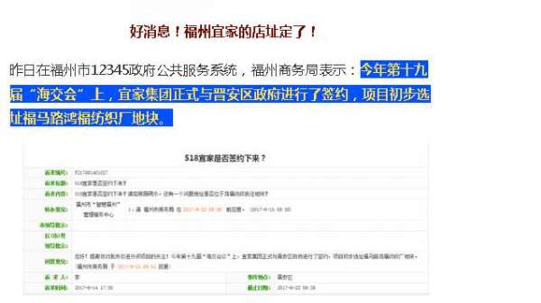 近日在福州市12345政府公共服务系统,福州商务局表示:今年第十九届“海交会”上,宜家集团正式与晋安区政府进行了签约,项目初步选址福马路鸿福纺织厂地块。