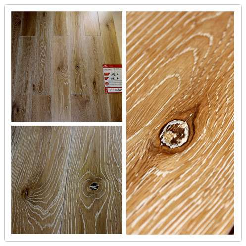 产品外观。这款地板的表面给人一种清新淡雅之感,行云流水般的的接口对纹,使得橡木自然的“山”字形纹路一线相连,浑然天成,尊贵大气。立体浮雕纹理和原木的天然疤节相结合,以手抚之,真实而又层次分明的手感跃然于指尖。