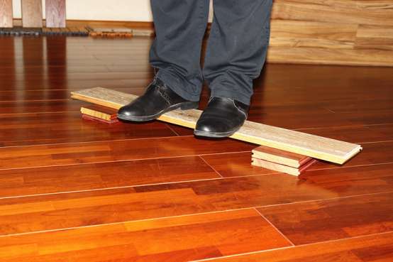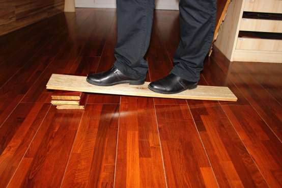 抗压测试。地面产品承重、受压是必要的,为了测试安信的这款橡木实木地板的抗压能力,测评人员请一位体重达90KG的成年男士站在用一块安信橡木实木地板搭成的“桥”上来回走动,感觉地板的质感坚实,且地板也没有任何变形和断裂的迹象。可见这款地板产品性能稳定,承重和受压能力优越。