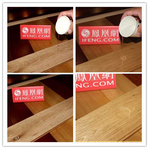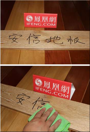 抗污测试。安信橡木实木地板的颜色较浅,一点点脏污便非常“刺眼”,为测试其抗污能力,测评人员用白板笔在地板表面写上“安信地板”四个大字,用沾了清水的抹布很容易就能擦拭干净,不留一点痕迹。