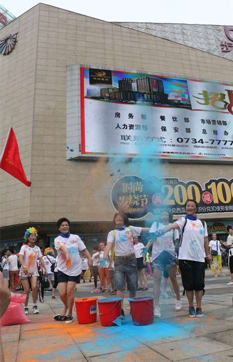 全民健身?炫彩雁城。6月24日,以“全民健身?炫彩雁城”为主题的“嘉宝莉漆第四届健康彩色跑”活动在衡阳市华新步步高广场开跑。3000多位经过色彩装扮的健康跑爱好者从华新步步高广场出发,经解放大道、红湘路、雅士林大桥补给站,最终到达终点碧桂园十里江湾,全程6公里。他们边跑边玩,或拍照留念,或色彩攻击,或大步流星,或闲庭信步,还在终点的碧桂园十里江湾举办了一场声势浩大的色彩排队狂欢。在欢声笑语度过了一个健康愉快的周末,也为历史悠久、山水优美的雁城增添了几许斑斓的色彩。