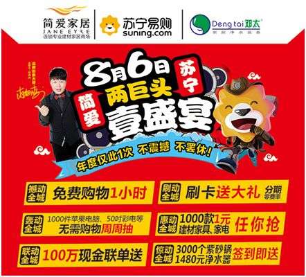 “2巨头?1盛宴”活动于7月22日至8月6日举行,为期16天。此次苏宁易购和简爱家居首次联盟创办大型活动,大信更是鼎力支持,调配各方有利资源。本次活动的优惠亮点如下: