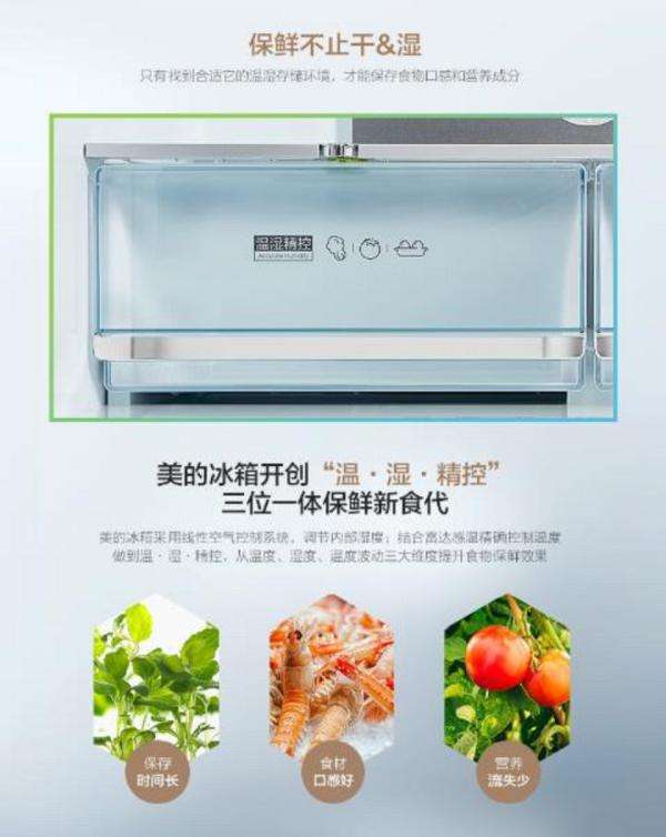 温湿精控技术是美的冰箱独创技术,包含了温度和湿度各自的精准把控。在温度控制上,美的在冷藏室设有独立的变温抽屉,由多个立体感温探头全时全方位检测冷藏室的温度,通过智能芯片来精确调控独立微风道冷量,从根本上防止温度波动,从而实现温度精控。在湿度控制上,冰箱搭配了独立气候舱,舱内通过湿度比例精控系统配搭调湿搁架,再根据食物最佳湿度自由切换不同湿度,从而实现湿度精细调节。最终,由美的532冰箱处理过的食材,会呈现出宛如刚从市场买回来的新鲜感。