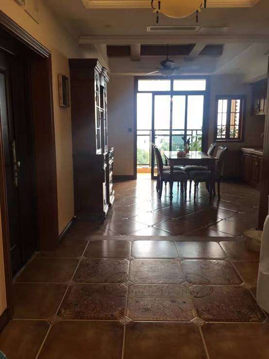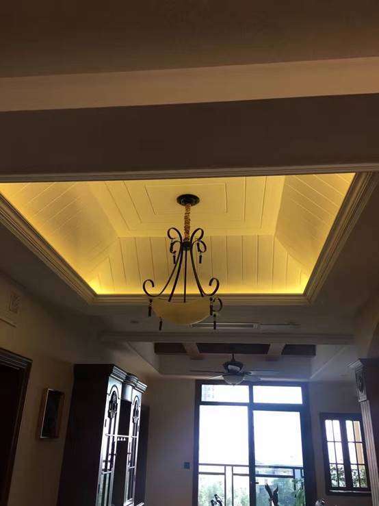 浓郁的色调是家居温馨而醇厚,更具生活气息,在安静的午后坐下来,喝一杯咖啡,聊聊点滴的生活,香浓回甘中享受安闲。客厅的美式吊顶搭配复古的灯具,整体感觉稳重大气。沙发背景是用木线条,中间用墙布点缀。进门吊顶采用内凹式的白色梯形吊顶,设计独特,彰显主人的个性。地砖采用仿古拼花的设计,使地面更加丰富多彩。生活不能没有新鲜,不能缺少的就是这一份安静与自然,午后慵懒的躺在阳台的休闲椅上,似乎可以将整个英伦风光收敛在家中。卫生间的墙面和地面用灰蓝色交错铺贴,中性色的搭配更具清爽,满眼都是悦目的享受。