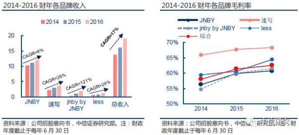借助主品牌JNBY近20年沉淀,公司已形成运营设计师品牌的完善体系。借此公司陆续推出自有品牌CROQUIS/jnby by JNBY/Pomme de terre/JNBYHOME,并收购了职业女装品牌less,形成一个发展有序/层次分明的品牌矩阵,2017上半财年JNBY/CROQUIS/jnby by JNBY/less收入占比60%/21%12%/6%。未来几年,随着JNBY稳健发展、CROQUIS/jnby by JNBY/less高速增长、Pomme de terre /JNBYHOME逐渐落地,公司收入/业绩有望实现18%/20%复合增长。同时公司将继续挖掘品牌培育能力,挖掘更多优秀国内/外优秀设计师品牌及团队,利用公司的综合品牌运营能力帮助新团队实现商业化发展。